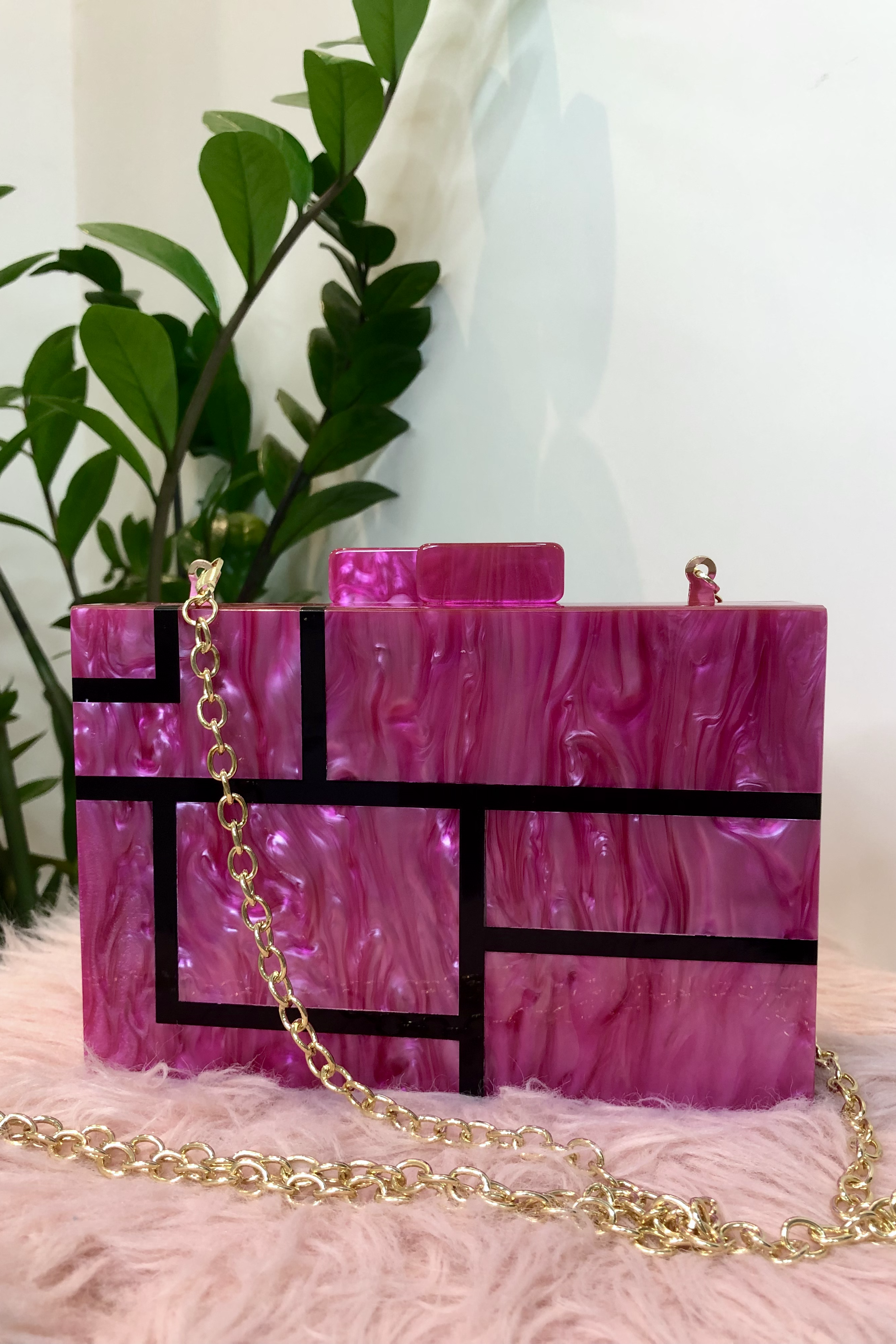 Clutch na cor pink, feita em material acrílico, com efeito madrepérola e detalhes geométricos em preto. Podendo utilizá-la com ou sem a alça dourada. Essa peça é indispensável para um look luxuoso.